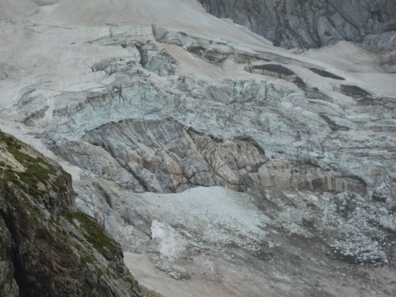 Toca desgrimpada fins arribar al peu de la glacera, amb precaució i sense cap pressa. Aquesta imatge ensenya una petita part de la glacera, és tot el que la boira ens ha permés captar...