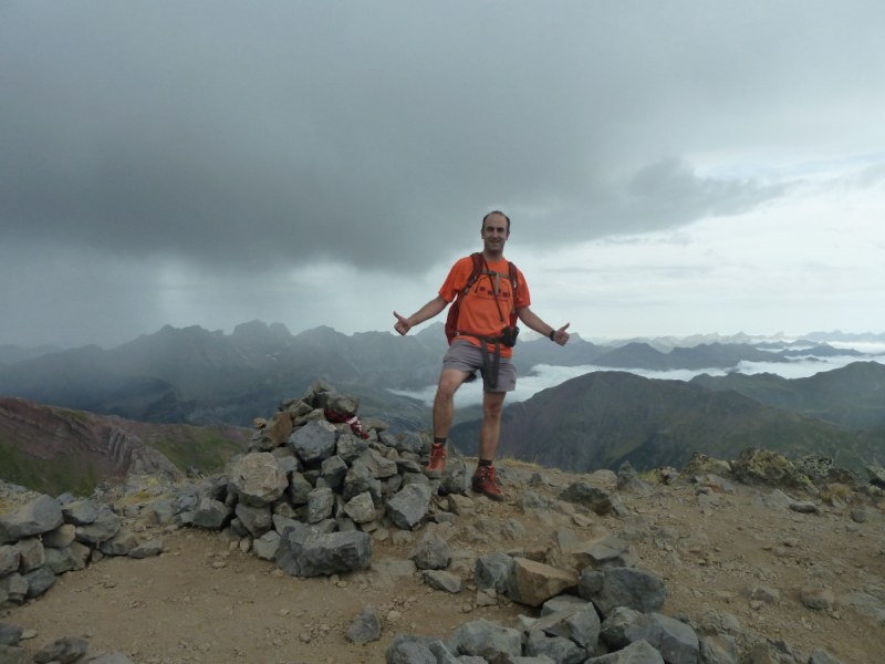 Cim del Pic d'Anayet (2574m), el temps empitjora i les cortines d'aigua cada vegada són més nombroses. Anem a fer una ullada ràpida a tot el que veiem